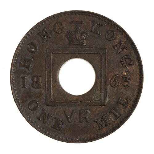 At centre, line square around circular central hole dividing the date 1863; above, crown; below, VR; around, HONG - KONG ONE MIL
