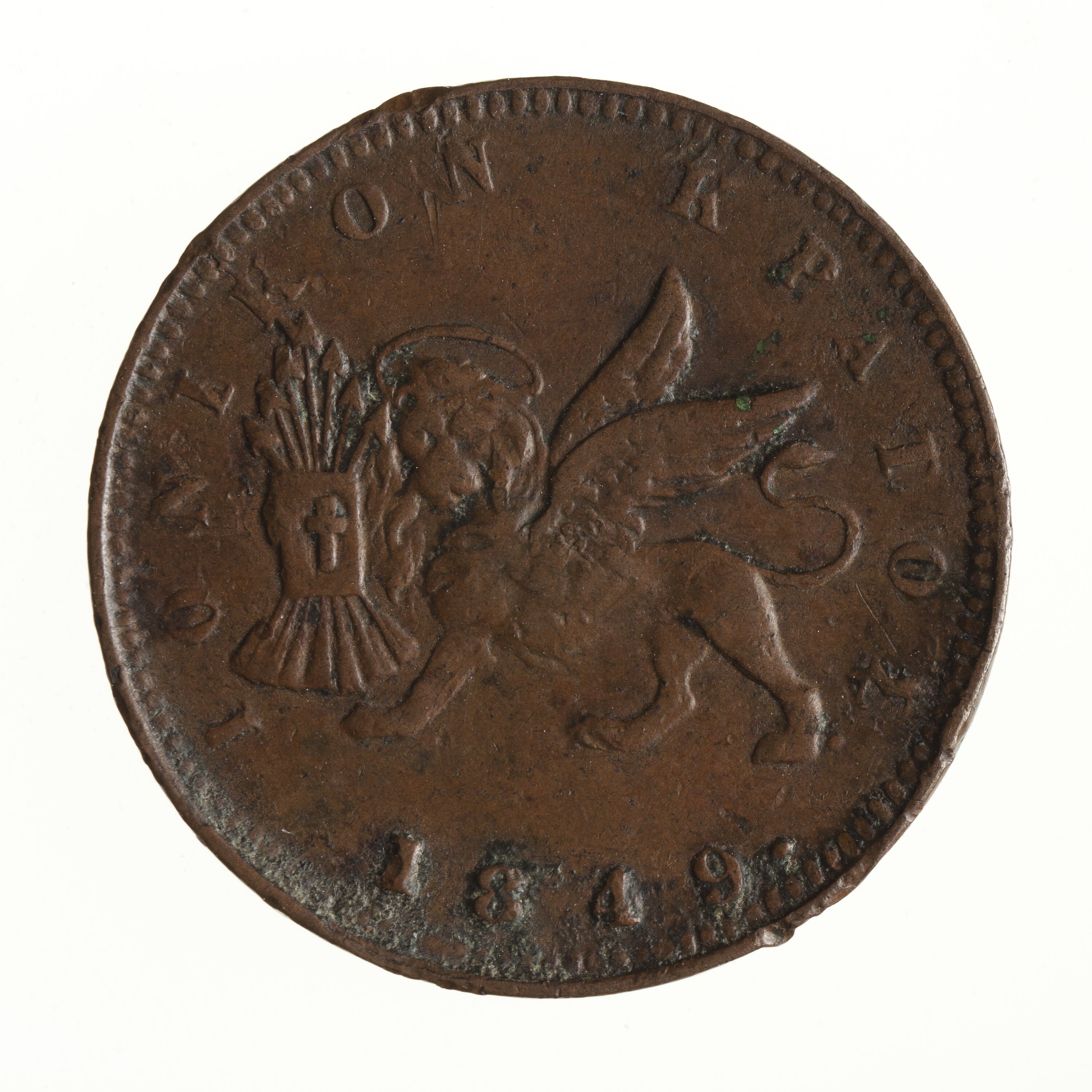 Winged lion of St. Mark facing to left holding Bible and seven arrows; below, 1849.; around above in Greek, IONIKON KPATOS