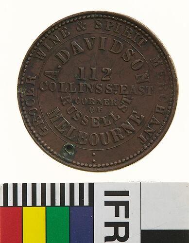 Obverse: A.DAVIDSON 112 COLLINS ST. EAST CORNER OF RUSSELL ST. MELBOURNE GROCER WINE & SPIRIT MERCHANT Reverse: VICTORIA 1862 IN VINO VERITAS T. STOKES MAKER MEL