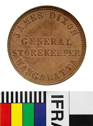 Copper one Penny token, a late strike, minted by Thomas Stokes of Melbourne. Commissioned by James Dixon, owner of a General Store in Wangaratta, Victoria. This token is a late-strike. Andrews notes that no original tokens struck for Dixon are known and that 'Dixon was unfortunate in business, and very soon after Stokes completed his order had to close down, and it is doubtful whether they ever circulated.'