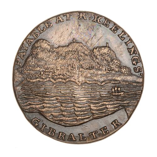 View of the Rock of Gibraltar with ship in sea in foreground; around asbove, PAYABLE AT R. KEELINGS; below, GIBRALTER