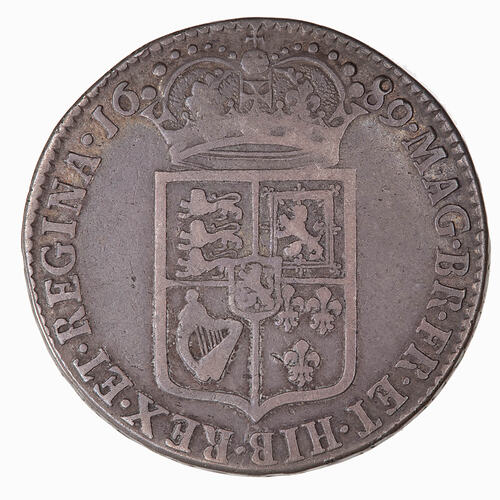 The laureate conjoined busts of William and Mary facing right; around, GVLIELMVS ET MARIA DEI GRATIA.
