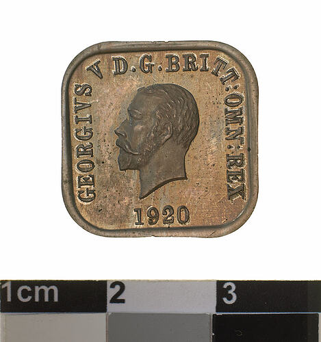 Between 1919 and 1921 a series of experiments were undertaken for a square coinage in nickel to replace the large bronze penny and halfpenny coins. The shape and size was based of a coin from Ceylon (Sri Lanka). These patterns were never authorised for issue.