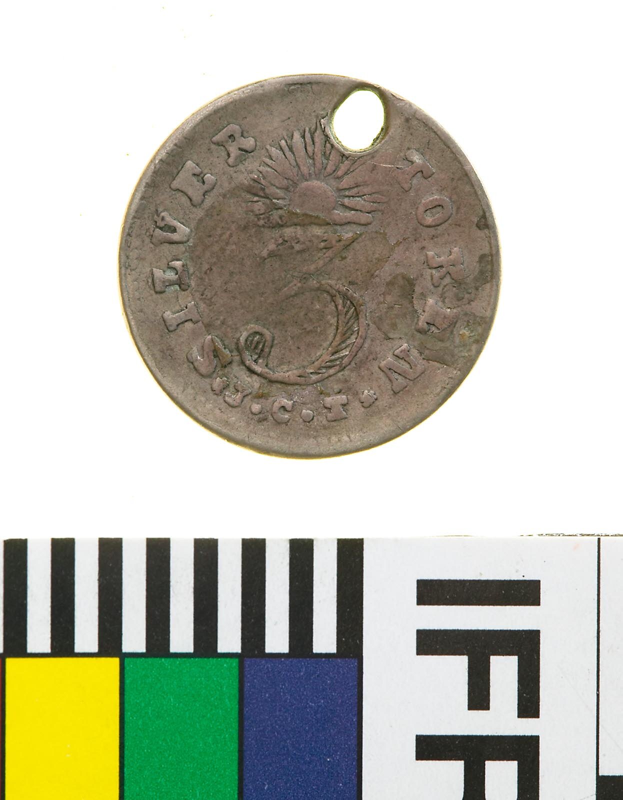 Obverse: SYDNEY NEW SOUTH WALES 18[54] (holed through last numerals of date) Reverse: 3 SILVER TOKEN * J.C.T.*