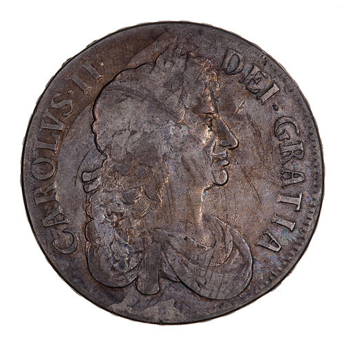 Laureate bust of Charles II facing right; around, CAROLVS . II . DEI . GRATIA