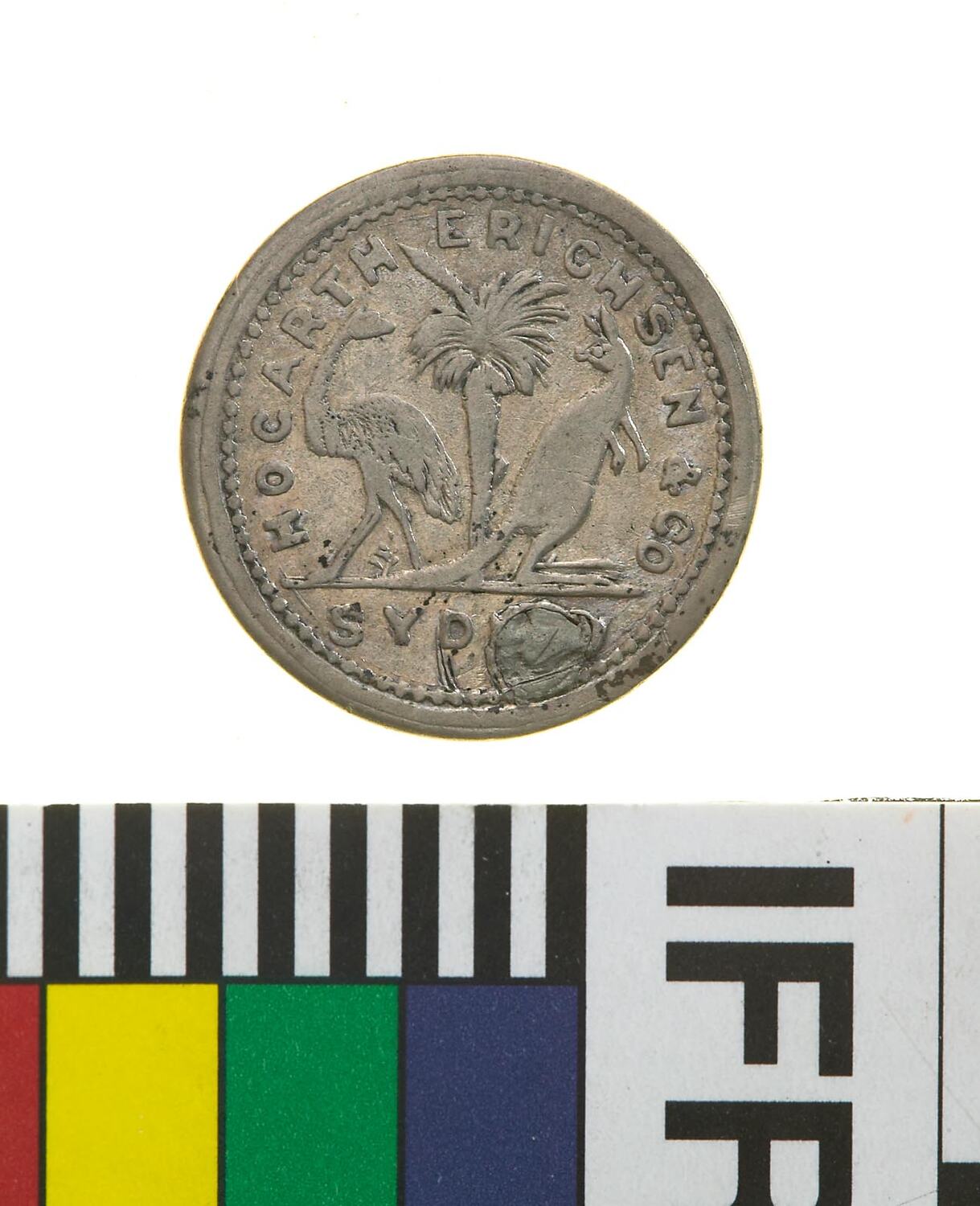 A round silver token (16 mm dia) featuring the name and partial address of the issuer: Hogarth, Erichsen and Co., Sydney around a kangaroo at right and emu at left standing either side of a small grass-tree. The kangaroo and emu standing on straight exergue line with the word SYDNEY in a straight line below. The reverse features the denomination "3" , 7 mm tall, within an oak wreath and breaking the date, 18 58. This token has been holed and plugged through the NEY of SYDNEY.