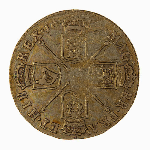 Four crowned shields, bearing the arms of England Scotland France and Ireland, arranged to form a cross; in the angles four septres surmounted by and orb, thistle, harp and lis; around, MAG . BR . FRA . ET . HIB REX 1685, the date being divided by the crown above the English shield. The second half of the date is difficult to read