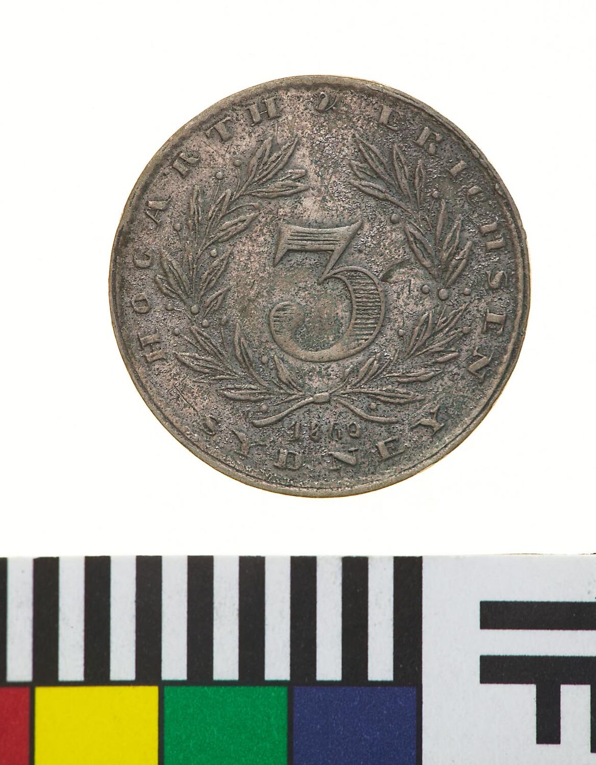 A round silver token (16 mm dia) featuring the name and partial address of the issuer: Hogarth, Erichsen and Co., Sydney around an olive wreath within which the denominational numeral '3' and below which the date, 1860 The reverse features a kangaroo, on left, and emu, on right standing either side of a grass-tree