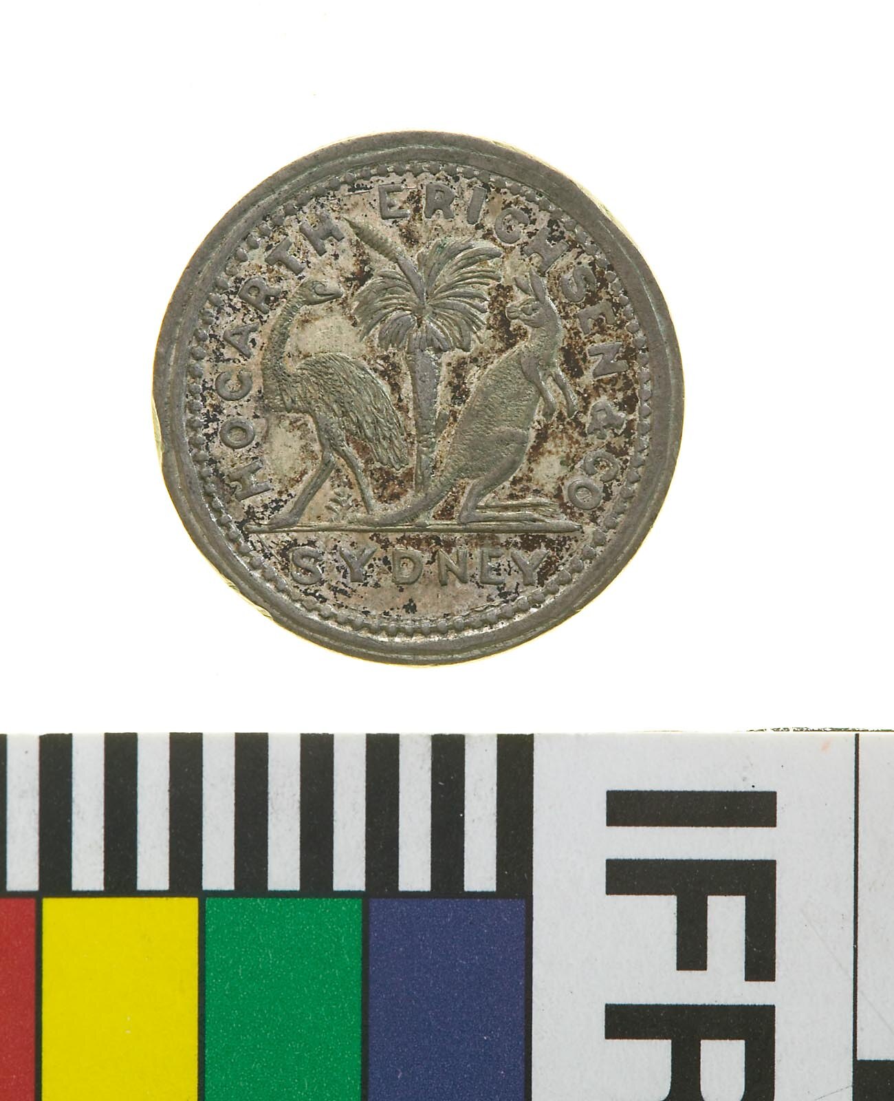 A round silver token (16 mm dia) featuring the name and partial address of the issuer: Hogarth, Erichsen and Co., Sydney around a kangaroo at right and emu at left standing either side of a small grass-tree. The kangaroo and emu standing on straight exergue line with the word SYDNEY in a straight line below. The reverse features the denomination "3" , 7 mm tall, within an oak wreath and breaking the date, 18 58. The quality of the silver in these tokens is generally thought poor.
