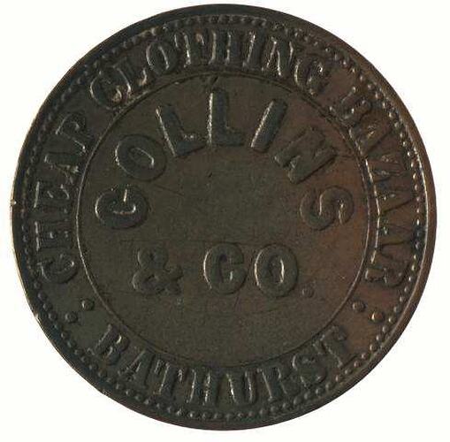Obverse: COLLINS & CO. CHEAP CLOTHING BAZAAR : BATHURST : Reverse: NEW SOUTH WALES 1864 T.STOKES MELBOURNE