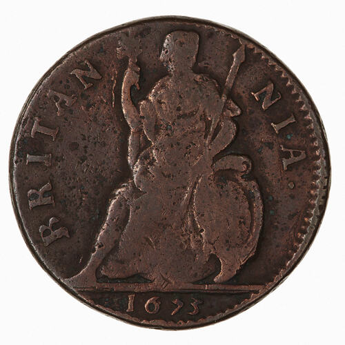 Britannia seated facing left on a globe, extending an olive branch and holding a spear, her left hand rests on a shield decorated with the crosses of St. George and St. Andrew; around, BRITANNIA; in exergue, 1673