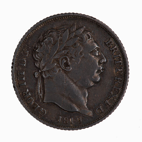 Laureate head of the King facing right; around, GEOR III D G BRITT REX F D ; below, 1819