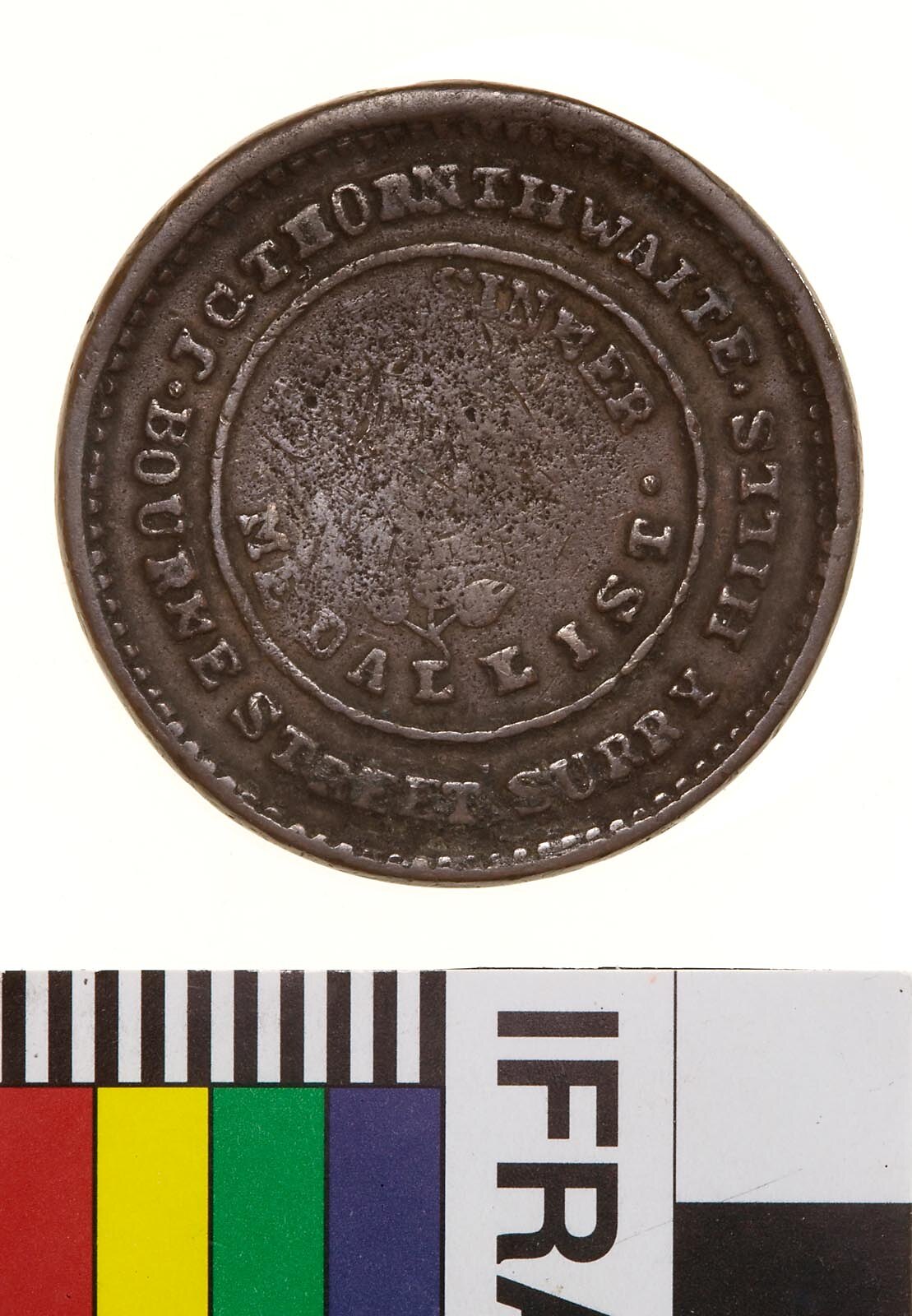 Within line circle, two roses (only partly struck up); around which, . DIE SINKER . / [AND] / MEDALLIST; around above, J.C.THORNTHWAITE; around below, . BOURNE STREET SURRY HILLS .