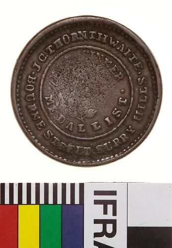 Obverse: J.C.THORNTHWAITE BOURNE STREET SURRY HILLS DIE SINKER [AND] MEDALLIST Reverse: ADVANCE AUSTRALIA 1854