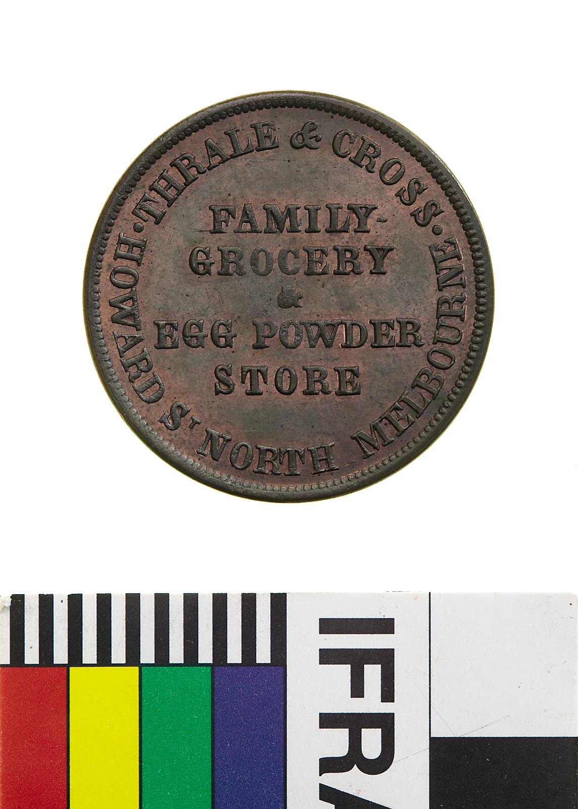 Obverse: THRALE & CROSS FAMILY GROCER & EGG POWDER STORE HOWARD ST. NORTH MELBOURNE Reverse: MELBOURNE W.J. TAYLOR MEDALLIST TO THE GREAT EXHIBITION 1851