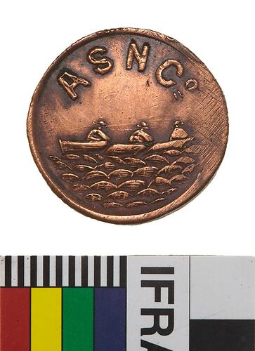 A uniface round copper token (31 mm dia) featuring the initials of the issuing company ASNCo and three men wearing hats in a boat on a choppy sea, two are rowing and the third steering.