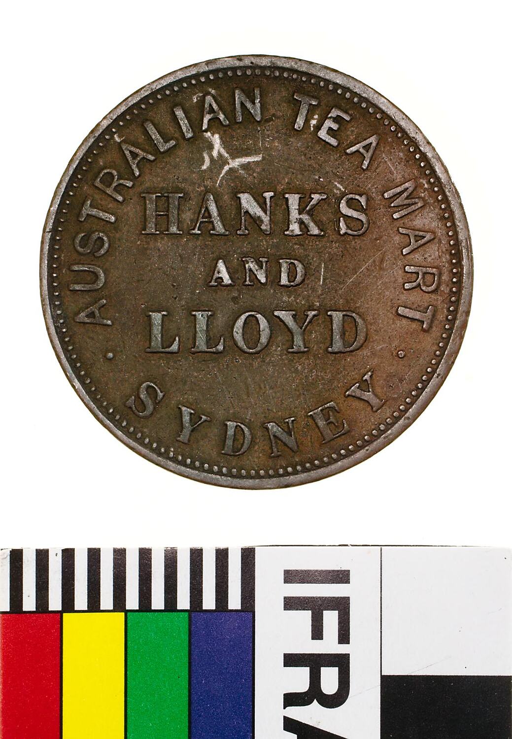Obverse: HANKS AND LLOYD AUSTRALIAN TEA MART SYDNEY Reverse: PEACE & PLENTY 1857 ADVANCE AUSTRALIA