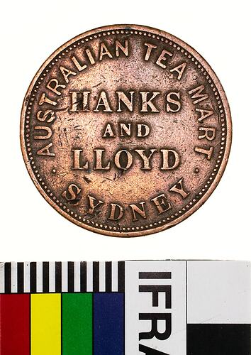 Obverse: HANKS AND LLOYD AUSTRALIAN TEA MART SYDNEY Reverse: PEACE & PLENTY 1857 ADVANCE AUSTRALIA
