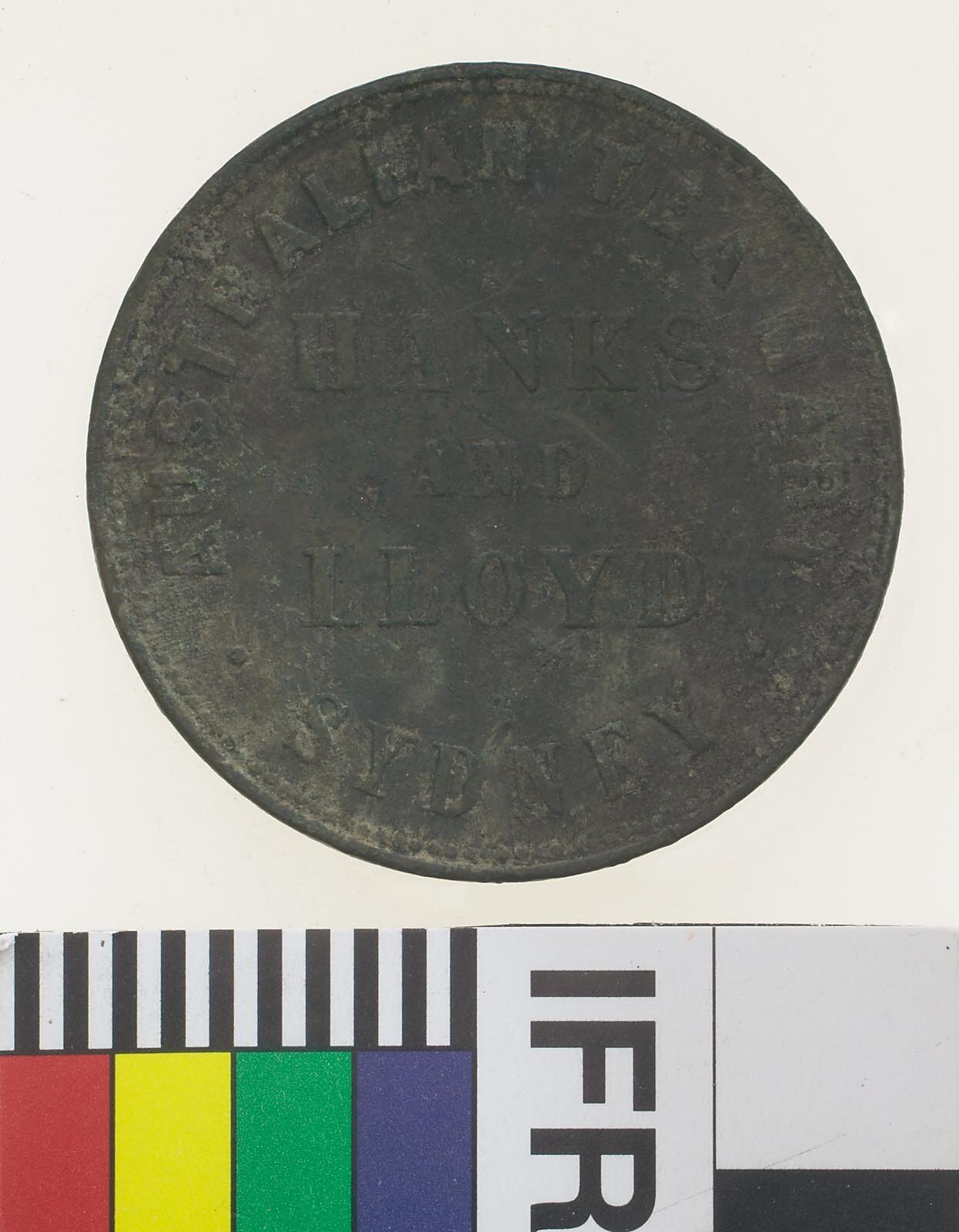 Obverse: HANKS AND LLOYD AUSTRALIAN TEA MART SYDNEY Reverse: PEACE & PLENTY 1857 ADVANCE AUSTRALIA