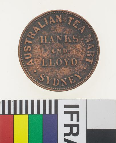 Obverse: HANKS AND LLOYD AUSTRALIAN TEA MART SYDNEY Reverse: PEACE & PLENTY 1857