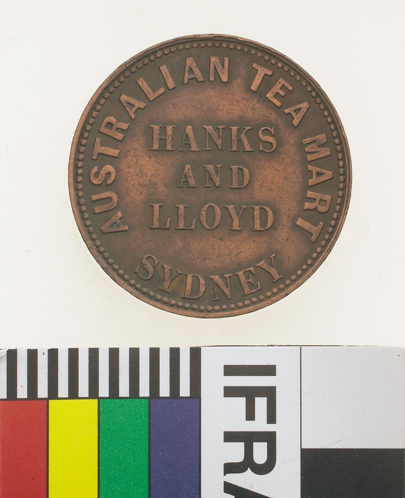 Obverse: HANKS AND LLOYD AUSTRALIAN TEA MART SYDNEY Reverse: PEACE & PLENTY 1857