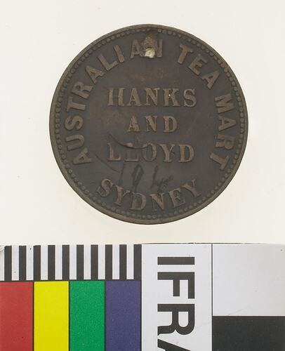 Obverse: HANKS AND LLOYD AUSTRALIAN TEA MART SYDNEY Reverse: PEACE & PLENTY 1857