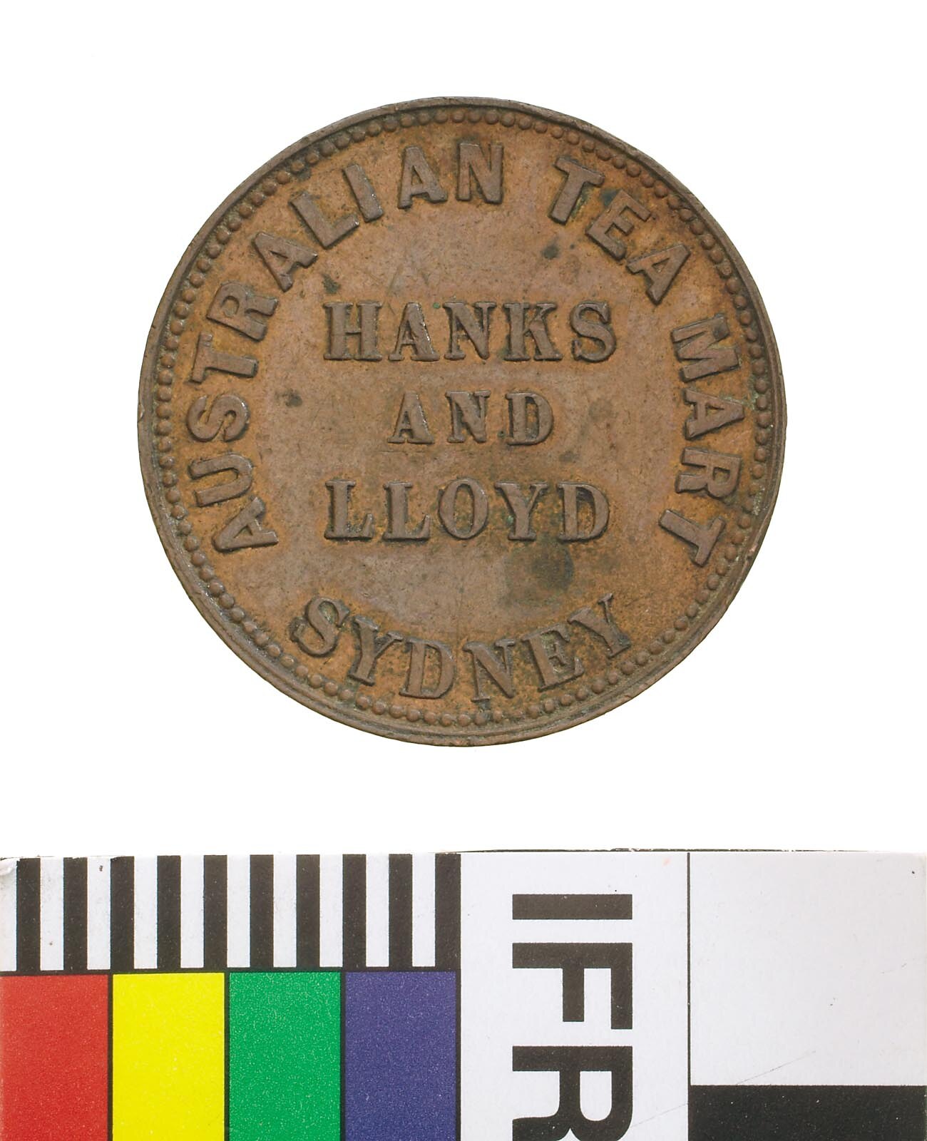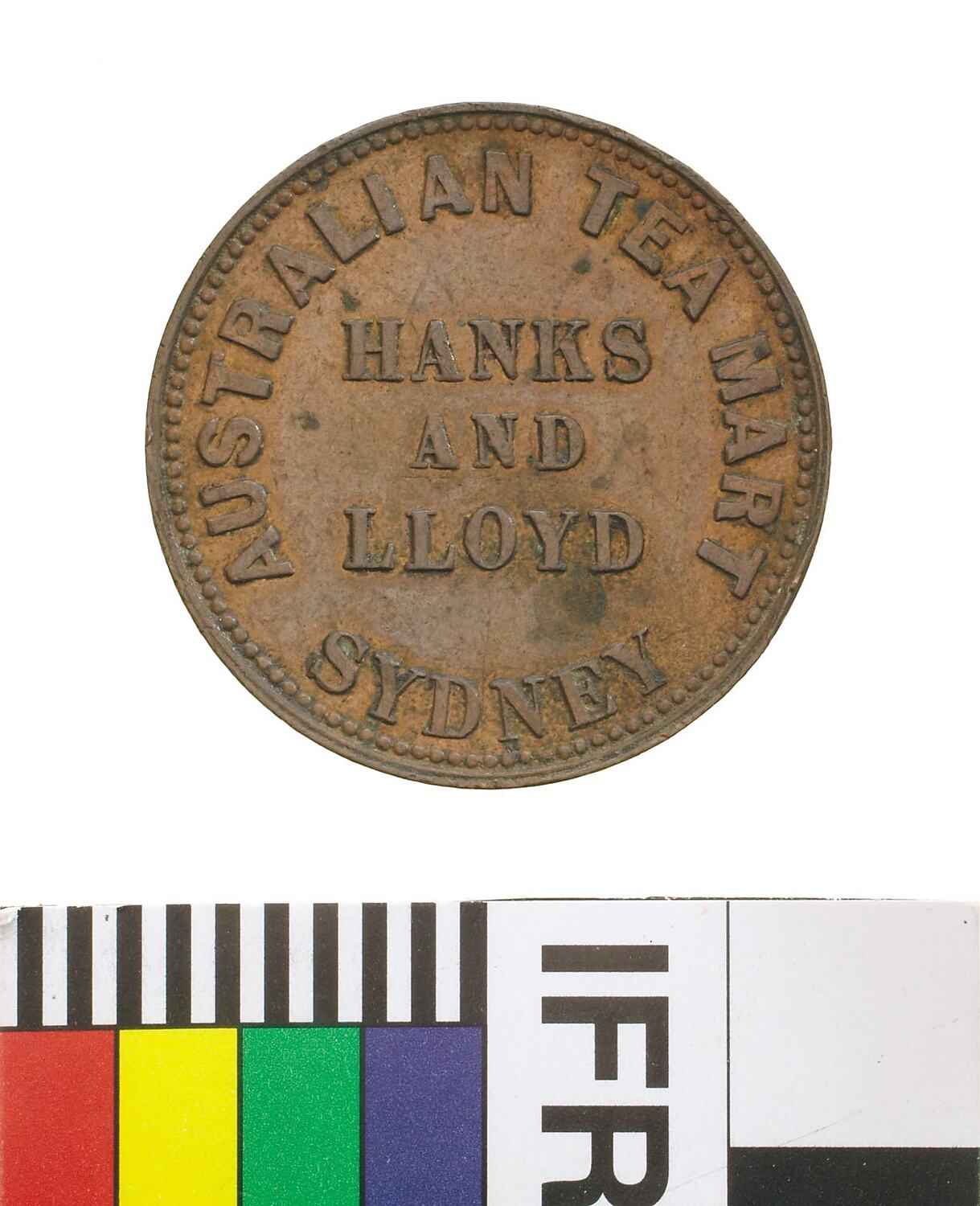 Obverse: HANKS AND LLOYD AUSTRALIAN TEA MART SYDNEY Reverse: PEACE & PLENTY 1857
