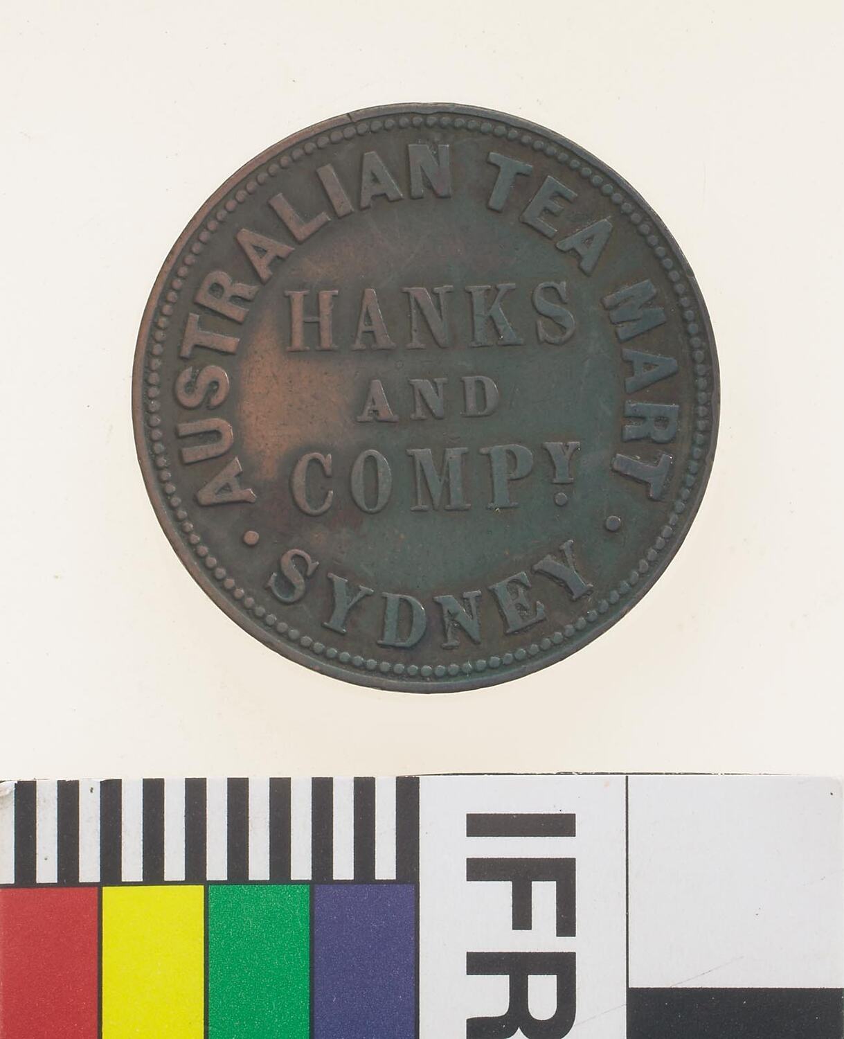 A round copper token (28 mm dia) featuring the name and business of the issuer: Hanks and Co., Australian Tea Mart Sydney The reverse features an Arms of New South Wales supported by a kangaroo and emu. This token has been cleaned and the obverse has toned slightly green.