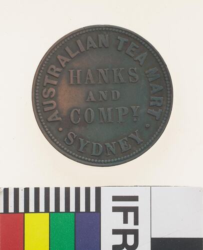 Obverse: HANKS AND COMPY. AUSTRALIAN TEA MART SYDNEY Reverse: PEACE & PLENTY 1857