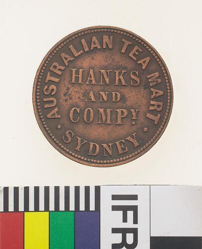 Obverse: HANKS AND COMPY. AUSTRALIAN TEA MART SYDNEY Reverse: PEACE & PLENTY 1857