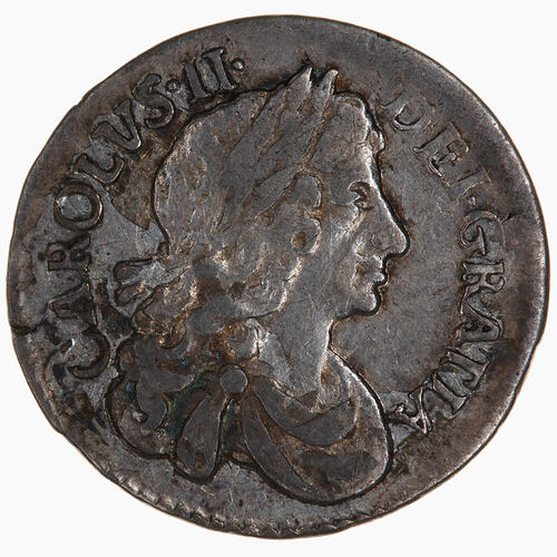 Laureate and draped bust of Charles II facing right; around, CAROLVS II DEO GRATIA