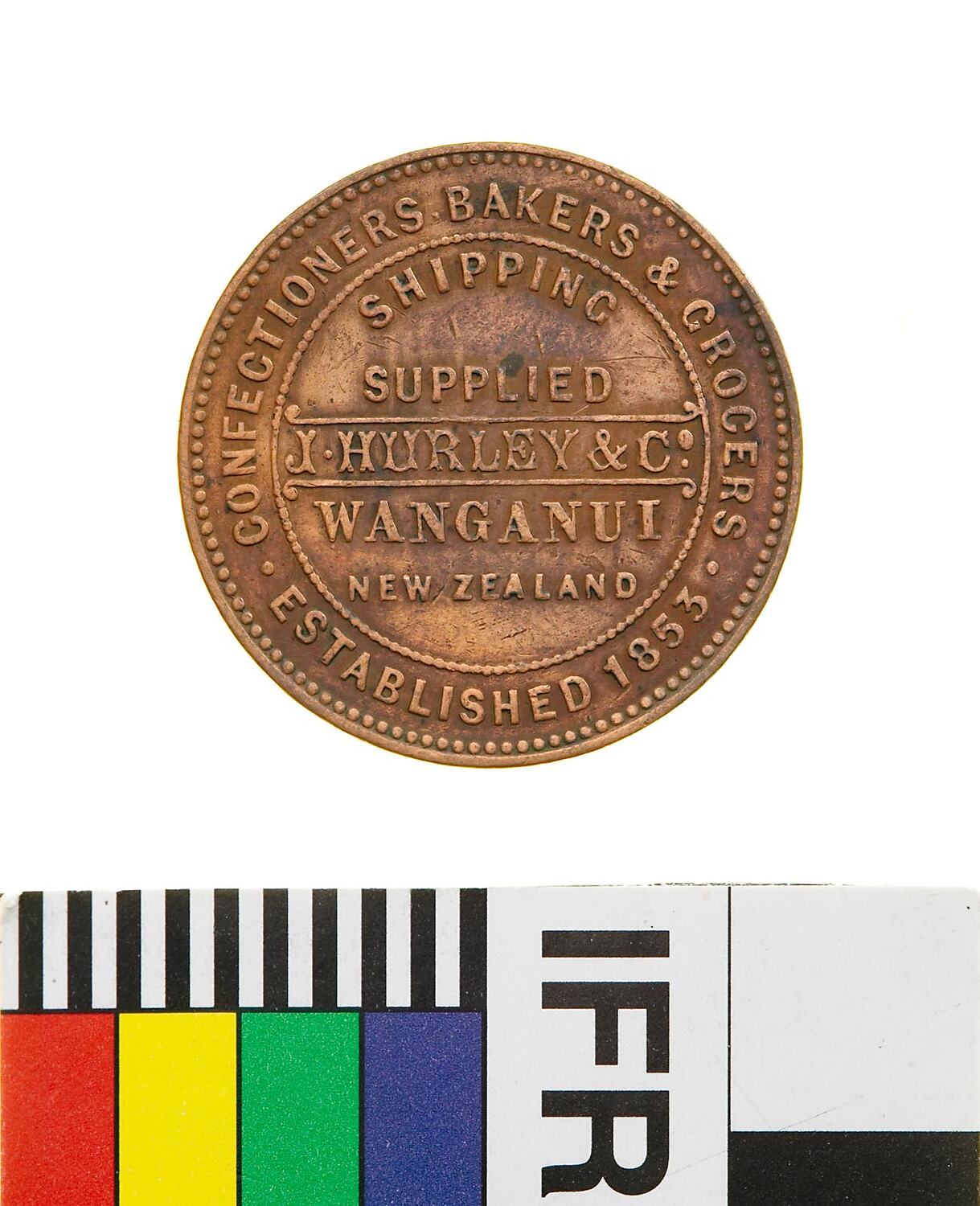 Bronze Halfpenny Token, minted by Todman, London. Issued by J. Hurley & Co, Wanganui, circa 1875. John Hurley migrated to New Zealand with his parents and siblings in 1842, at the age of 12. They settled in Wellington where his father, Alexander, ran a bakery on Lambton Quay. In 1853 John moved to Wanganui and opened his own bakery. His range of goods included bread, biscuits, confectionery and groceries; he also supplied ships. He married a local woman, Lorenna Cunnabel, on January 24, 1855 at Brunswick Station, a few miles from the town. They had four children. Hurley sold his business on the 8th of January 1857 to a wealthy local man, Mr Joseph Augustus Burnett. However in 1864 he bought it back. The same year Hurley's brother Henry arrived in Wanganui. An almanac advertisement from 1878 showed how John Hurley's business had expanded. As well as bread, biscuits and confectionery, he also listed wholesale and retail grocery and emphasised his ability to create wedding cakes. Hurley later built a much more substantial bakery, a two storey, double fronted wooden building with glass across the front.