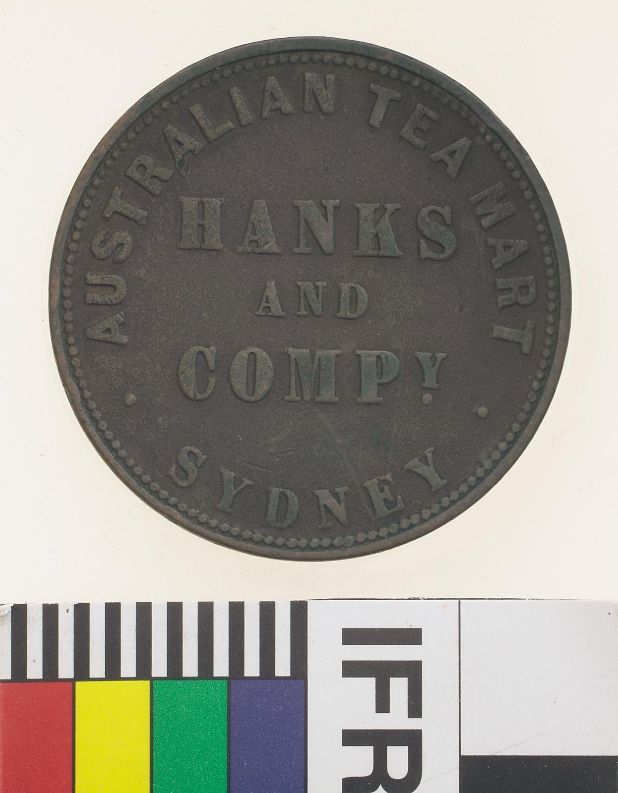 A round copper token (34 mm dia) featuring the name and business of the issuer: Hanks and Co. , Australian Tea Mart Sydney The reverse features an Arms of New South Wales supported by a kangaroo and emu. This token has been cleaned and the obverse has toned slightly green.