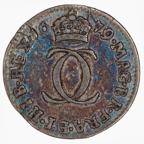 At centre, a crown above two interlocked Cs; around, MAG. BR. FRA. ET. HIB. REX. 1679 the date divided by the crown.