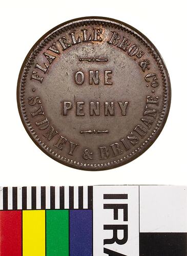 At centre between two plain scrolls, ONE / PENNY; around, FLAVELLE BROs. & Co. . SYDNEY & BRISBANE .