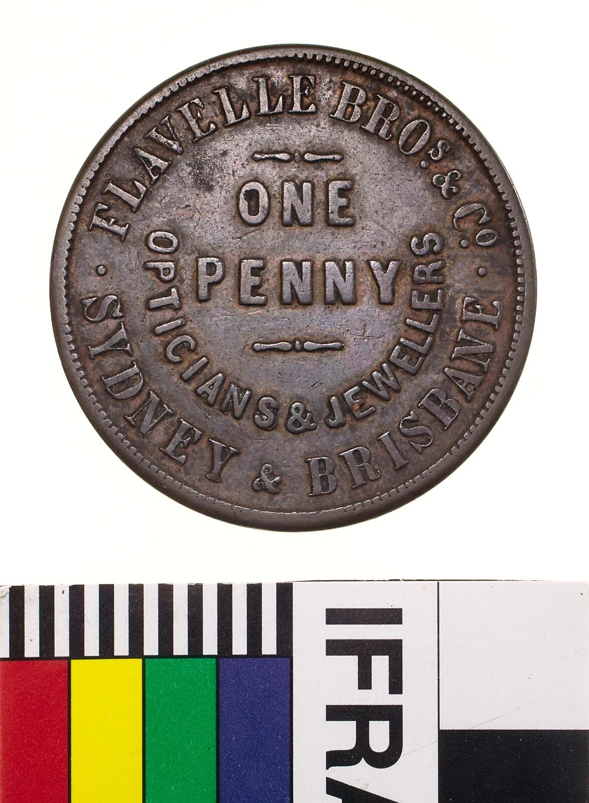 Obverse: FLAVELLE BROs. & Co. ONE PENNY SYDNEY & BRISBANE OPTICIANS & JEWELLERS Reverse: W.J.TAYLOR LONDON