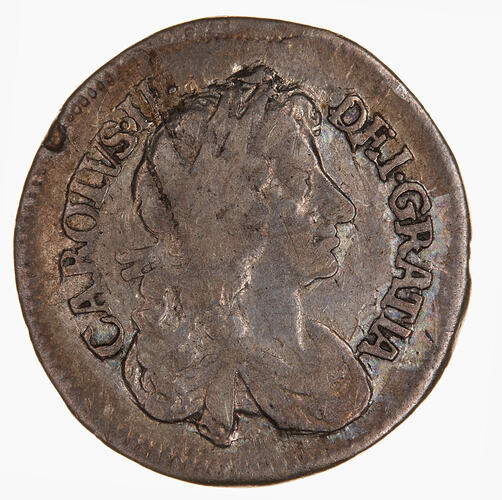 Laureate and draped bust of Charles II facing right; around, CAROLVS II DEO GRATIA
