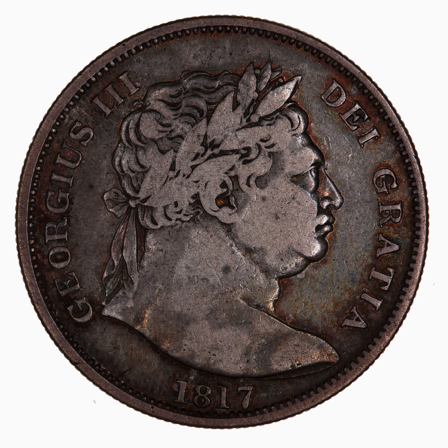 Laureate bust of the King facing left, undraped, around, GEORGIUS III DEI GRATIA, below, 1817
