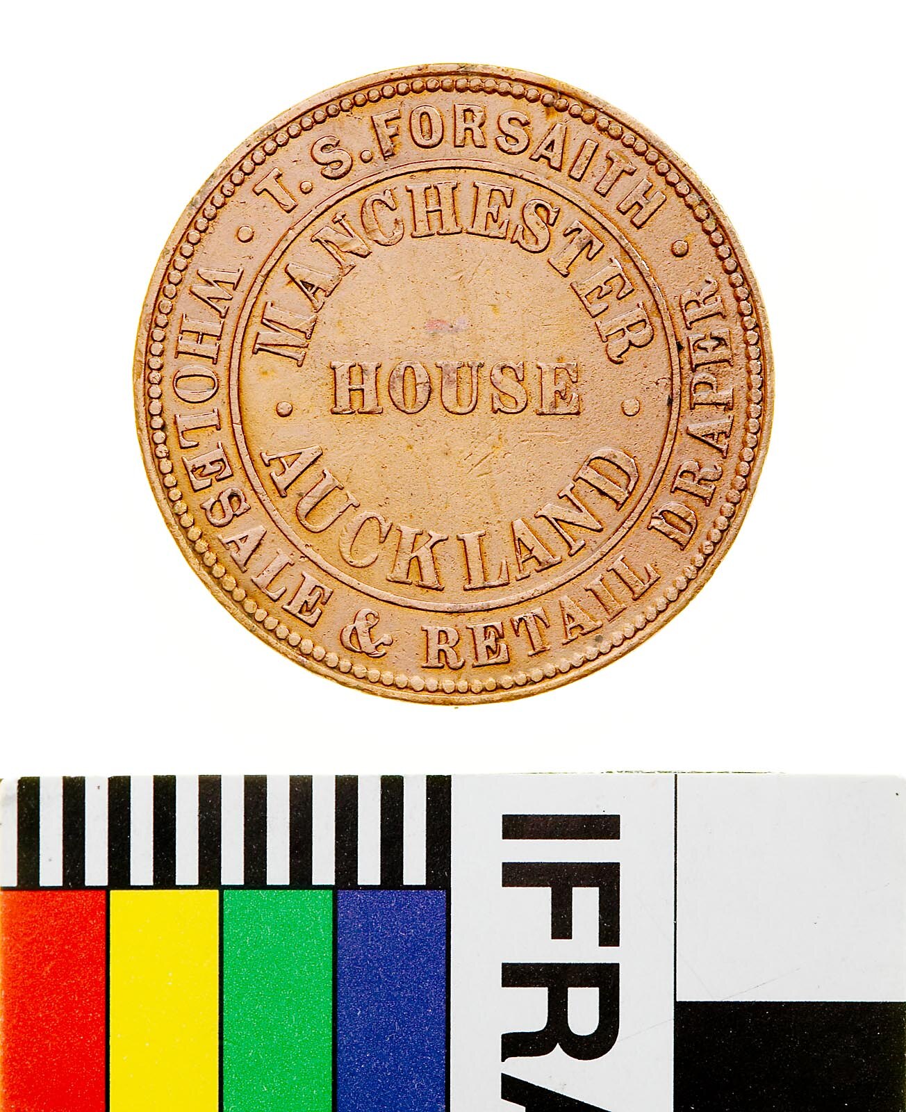 Obverse: T.S. FORSAITH MANCHESTER HOUSE AUCKLAND WHOLESALE & RETAIL DRAPER Reverse: NEW ZEALAND 1858