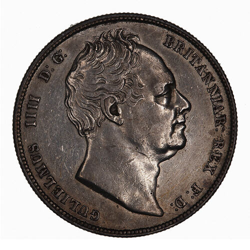 Bare head of the King facing right; around, GULIELMUS IIII D:G: BRITANNIAR: REX F:D:. The artist's initials, W.W. (William Wyon) incuse in script on neck truncation