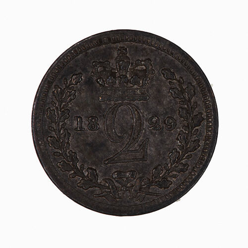 Within an open oak wreath, the numeral 2, crowned and dividing the date 1829
