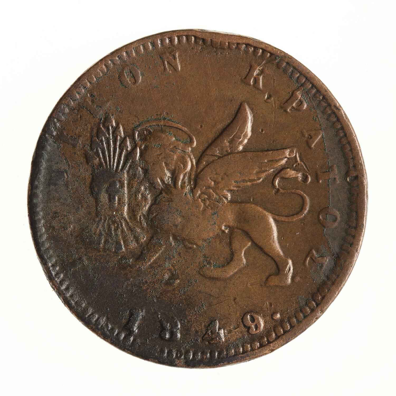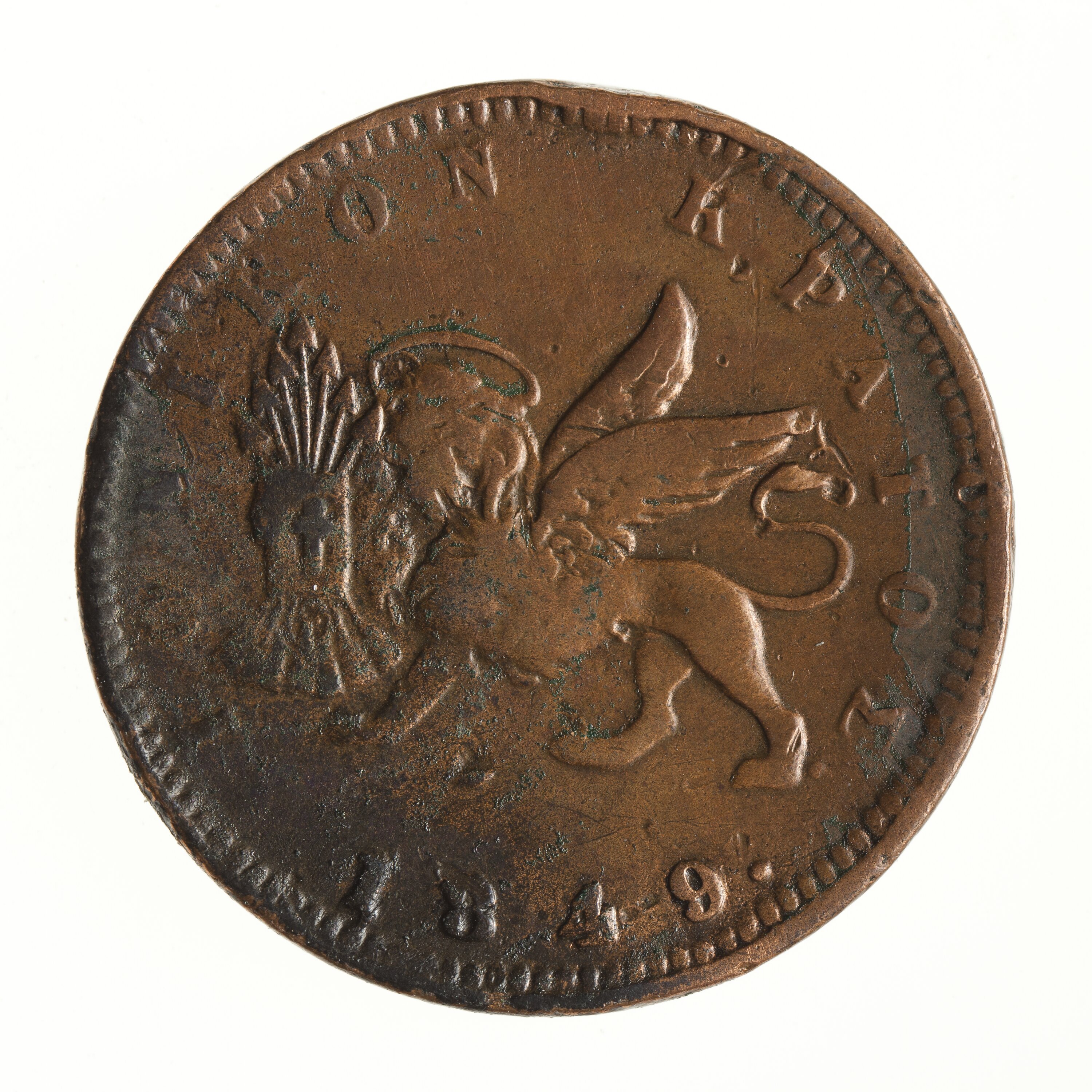 Winged lion of St. Mark facing to left holding Bible and seven arrows; below, 1849.; around above in Greek, IONIKON KPATOS