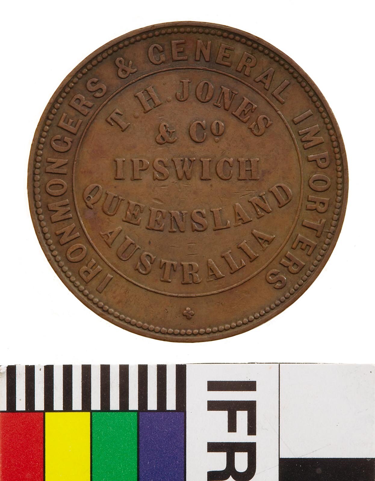Obverse: T.H. JONES & Co. IPSWICH QUEENSLAND AUSTRALIA IRONMONGERS & GENERAL IMPORTERS Reverse: AUSTRALIA G