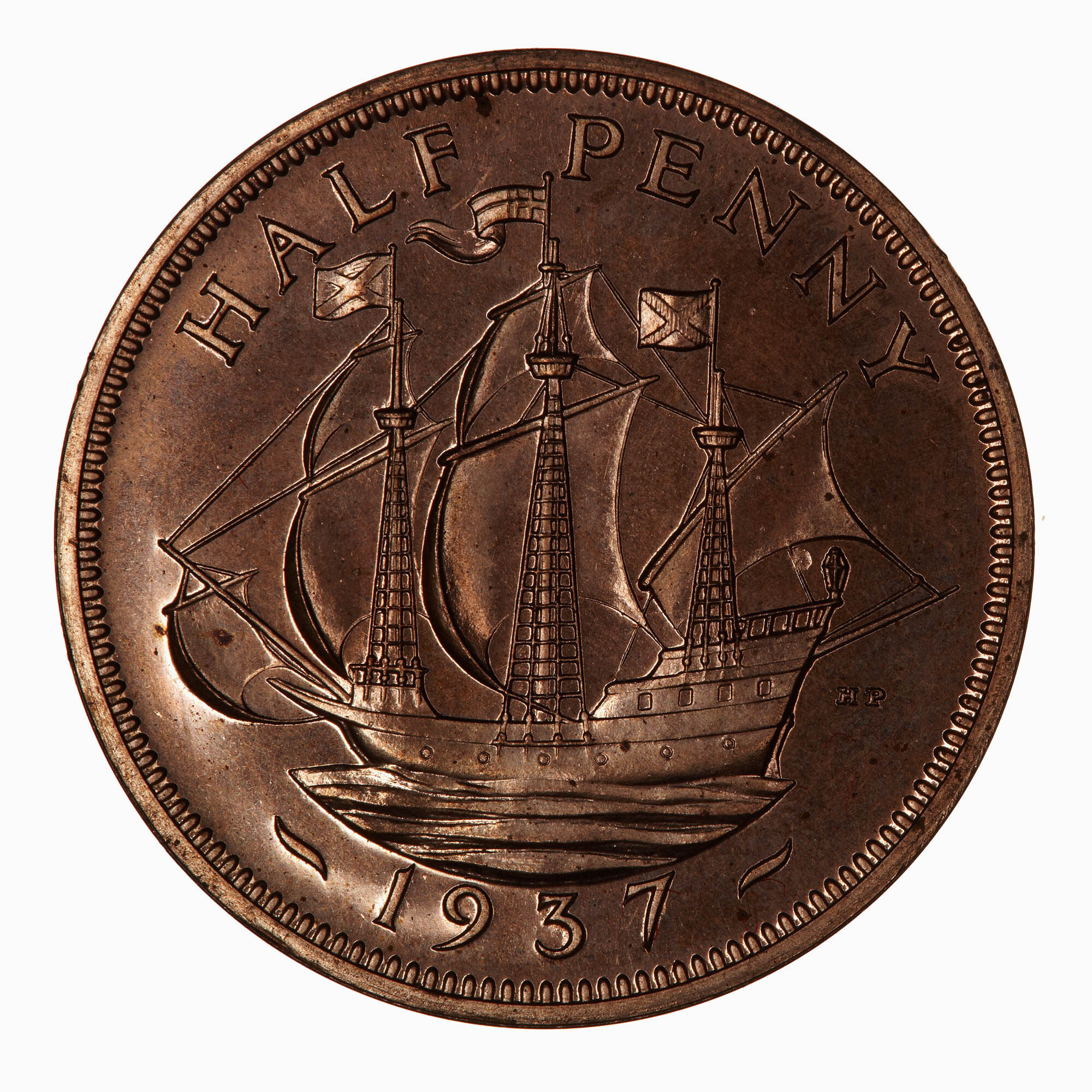 Three-masted sailing ship (the Golden Hind) to left; behind in small letters HP (T. Humphrey Paget); around above, HALF PENNY; below, 1937