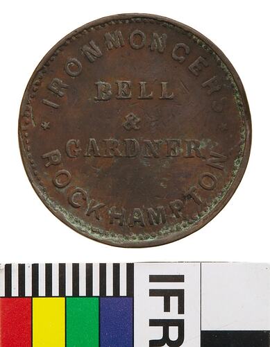 Copper One Penny Token, minted by J. C. Thornthwaite, Surry Hills, New South Wales. Issued by Bell & Gardner, Ironmongers, Rockhampton, circa 1855. The earliest surviving Rockhampton newspapers date from 1865, and Bell and Gardner advertised in some of the earliest surviving editions. A small advertisement on page 3 of the Rockhampton Bulletin for 13 January 1865 locates their trade as 'Wholesale and Retail Ironmongers'. Bell and Gardner also took out a half page advertisement in Pugh's Queensland Almanac for 1866, in which they described their wares: 'Importers of Iron, Steel, Lead, Oils, Paints, Tools of every description, General and Furnishing Ironmongery, Lamps, Rope, & Also- China, Glass, & Earthernware.'