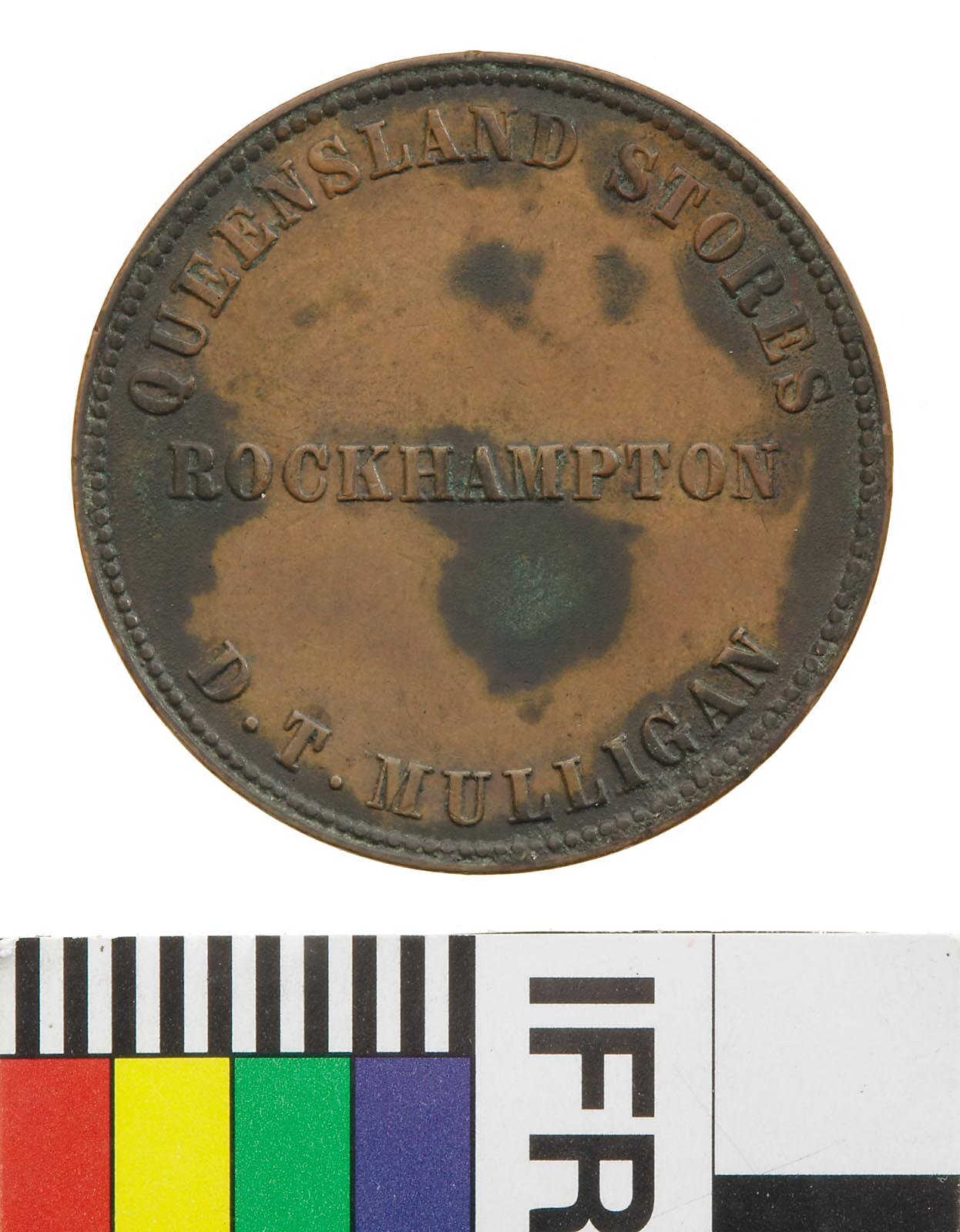 Obverse: QUEENSLAND STORES ROCKHAMPTON D.T.MULLIGAN Reverse: QUEENSLAND 1863 ADVANCE AUSTRALIA