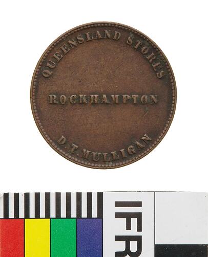 Copper Halfpenny Token, minted by W.J. Taylor, London. Issued by D.T. Mulligan, Queensland Stores, Rockhampton, 1863. It is likely that Mulligan opened his 'Queensland Stores' in either 1862 or 1863, after the discovery of Copper and Gold at nearby Peak Downs. The Early History of Rockhampton includes the following comment about Mulligan and his tokens: 'Copper (coins) were even harder to get than Silver and several of the leading business people had copper tokens struck, which were accepted as pennies, while at the same time they served as advertisements. The late Mr D.J [sic] Mulligan circulated a large number of these tokens, which remained in use for ten or fifteen years.' Mulligan is said to have 'sold out to H.F. Walton, and retired to Ireland, where he died.' (Rockhampton City Council, personal correspondence).