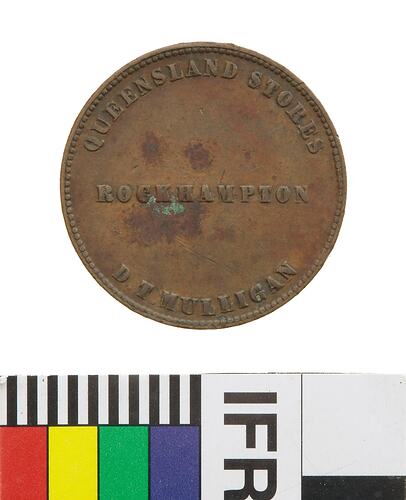 Copper Halfpenny Token, minted by W.J. Taylor, London. Issued by D.T. Mulligan, Queensland Stores, Rockhampton, 1863. It is likely that Mulligan opened his 'Queensland Stores' in either 1862 or 1863, after the discovery of Copper and Gold at nearby Peak Downs. The Early History of Rockhampton includes the following comment about Mulligan and his tokens: 'Copper (coins) were even harder to get than Silver and several of the leading business people had copper tokens struck, which were accepted as pennies, while at the same time they served as advertisements. The late Mr D.J [sic] Mulligan circulated a large number of these tokens, which remained in use for ten or fifteen years.' Mulligan is said to have 'sold out to H.F. Walton, and retired to Ireland, where he died.' (Rockhampton City Council, personal correspondence).