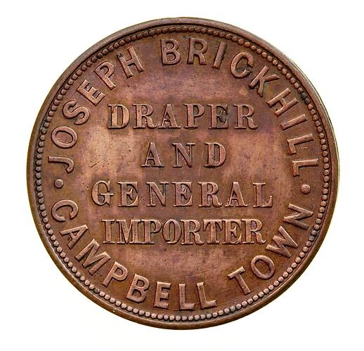 A circular copper token (34 mm diameter) with the name, address and business of the issuer: Joseph Brickhill, Commercial House, Campbell Town, draper and general importer. The token has no pictorial element but also provides the denomination and date. This token is in uncirculated condition, lightly toned.