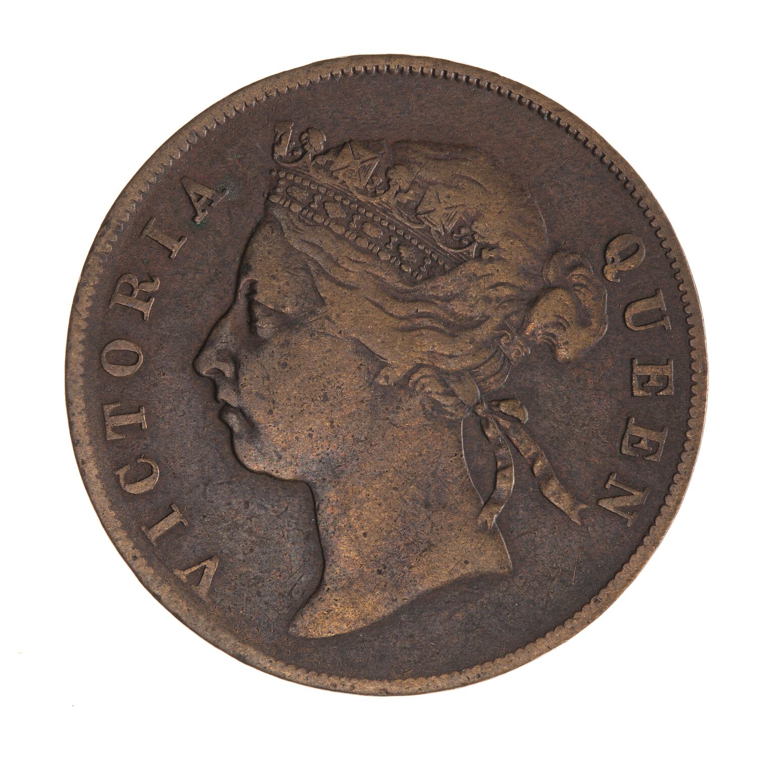 Head of the Queen, wearing coronet or diadem ornamented with jewels, facing left; around, VICTORIA QUEEN. The ends of the coronet are connected by a band decorated with a scroll which is partly hidden by the hair. The hair is drawn into a knot behind the head and teied with a bow at the back of the head.